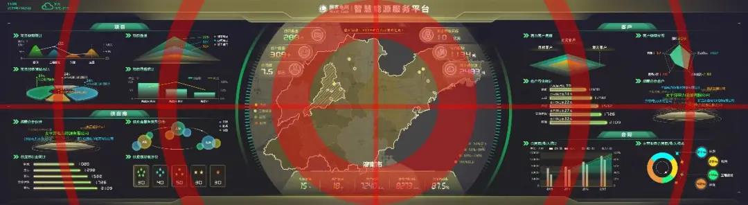 再者,設計人員需要明確大屏的視覺路線即展示路線,這條線能講出怎樣的故事跟你的布局構圖密切相關。下面提供幾種常見的構圖思路,希望對大家有所啟發和幫助。 1、中心放射型 以中間核心內容向周圍放射,正中多以地圖和給人視覺沖擊的主視覺為主,起到聚焦凸顯的作用,層次明晰,主次分明。